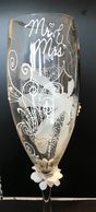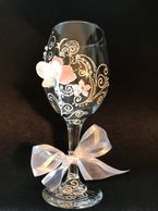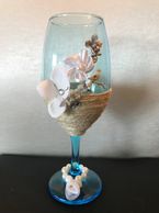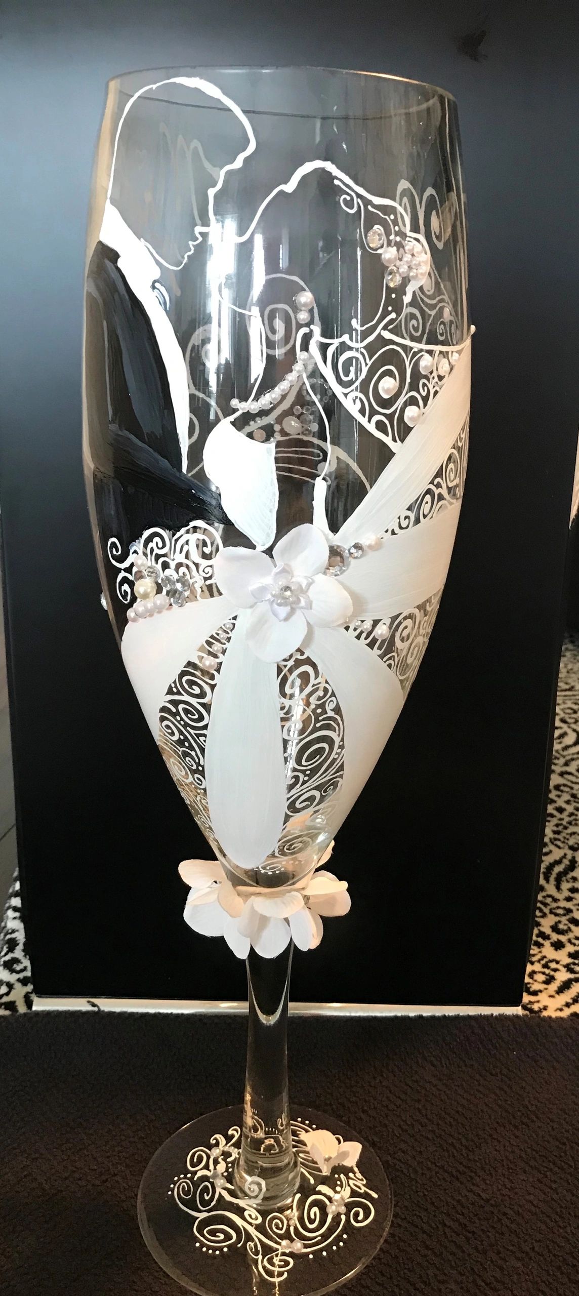 Hand-painted delicate design on an over-sized (20"h) champagne flute makes a great centerpiece and keepsake. Cured and embellished with pearls, crystals and petals. Retail $238